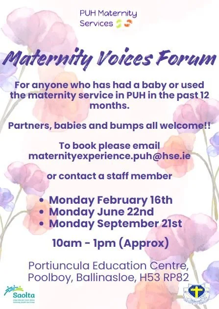 Please come join members of the maternity team, including Midwives and Doctors, for an interactive morning, to help us listen, understand and improve the maternity experience at Portiuncula University Hospital.